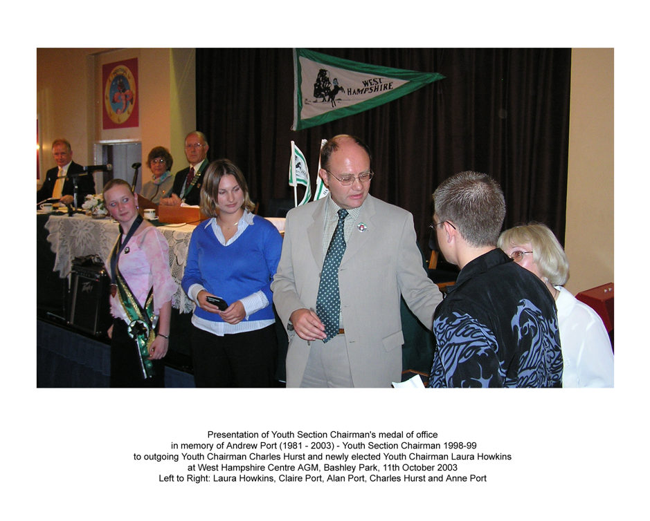 ![]() | Andrew became the first West Hampshire Youth Section Chairman when he was elected to the position in October 1998. The ‘leader of the Youth Section had previously been the Youth Section Secretary. Andrew had rallied with his parents, Alan and Anne and his big sister Claire since he was six years of age and had been an enthusiastic member of the Youth Section and Committee member before and after his time as Chairman. Andrew joined the Royal Navy in 2001 but still attended rallies with his family whenever the opportunity arose.He attended rallies the annual Competitions Rally at Sparsholt College, Winchester in July 2003, the day before he tragically died in a road accident. Over 200 Centre members attended Andrew’s military funeral held at HMS Collingwood in Gosport. |